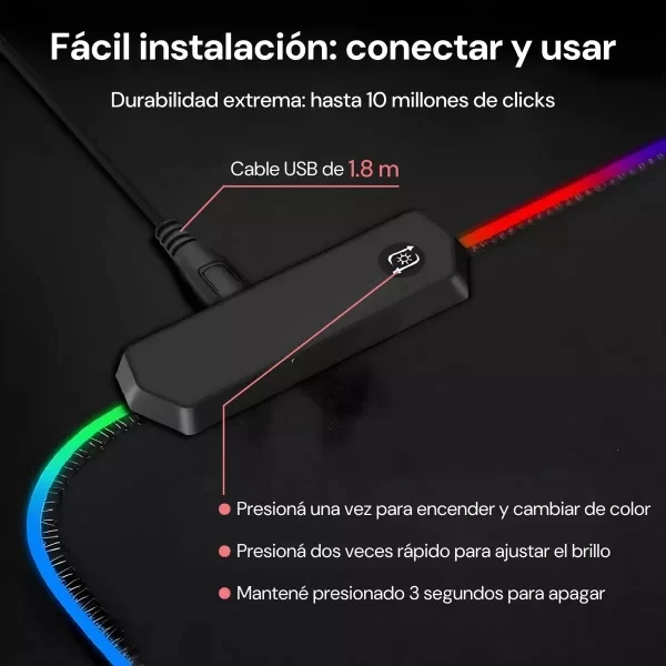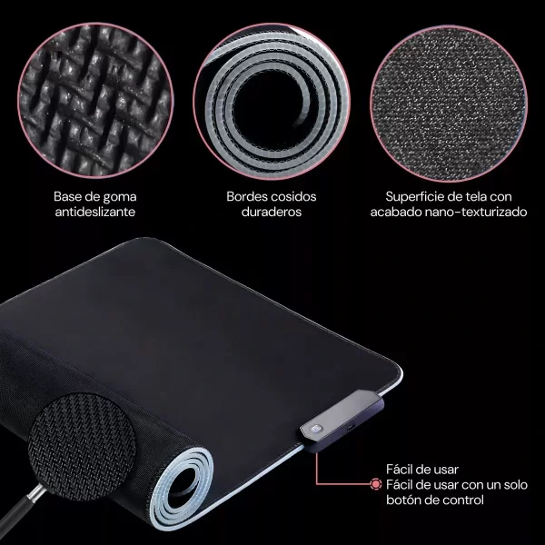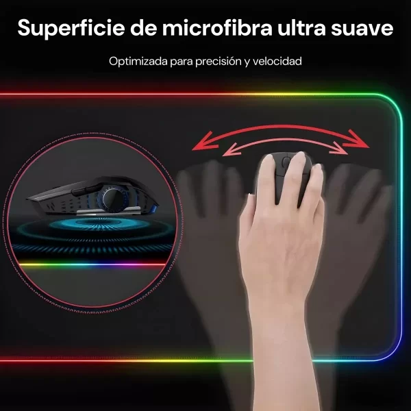 La base de goma antideslizante mantiene el mouse pad fijo en su lugar, incluso en las sesiones de juego más intensas. Además, los bordes cosidos reforzados aumentan la durabilidad y evitan el desgaste con el tiempo. Gracias a su diseño RGB con iluminación dinámica, podés personalizar la estética de tu setup con múltiples modos de color, incluyendo opciones estáticas, efecto respiración y transiciones de luces envolventes.